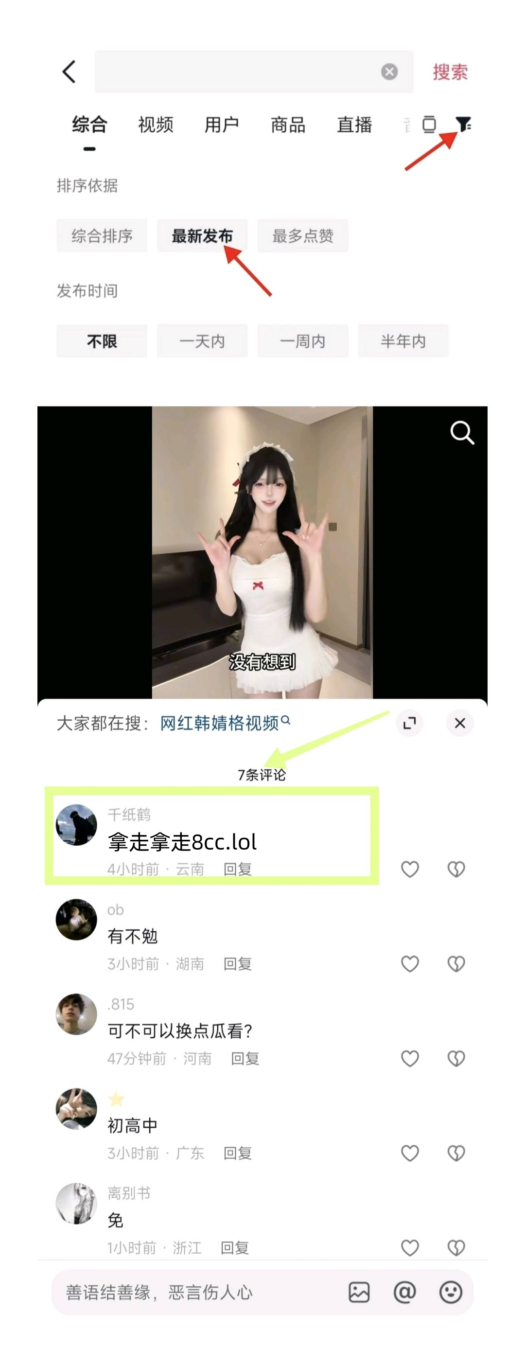 打开 抖音 搜索 关键词,点右上角选择最新发布的作品,,选4个视频评论并截图 上面刚保存的文案,每个视频评论一条最后给自己 点个赞 ,并截图👇如下图所示👇